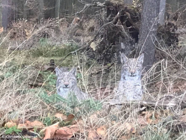 Da sich die Luchsgruppe im unübersichtlichen Unterholz verteilt hatte, sind jeweils nur zwei oder drei Jungtiere auf einem Foto zu sehen. Das Jungluchs-Quartett steht allerdings außer Frage, da die vier Jungen bereits mehrfach in diesem Waldgebiet beobachtet wurden.