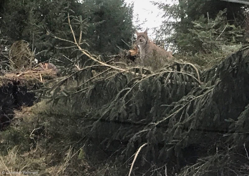 So hatte ein Forstarbeiter Anfang Oktober von vier gleichgroßen Luchsen berichtet, die er auf einem Holzlagerplatz beobachten konnte, als sie dort in der Morgendämmerung auf den Baumstämmen spielten. Es ist naheliegend, dass dort die vier Jungtiere zu sehen waren. Die Luchsin wurde offenbar nicht bemerkt. Die zuständige Luchsbeauftragte suchte wenig später die Holzstapel nach weiteren Hinweisen ab und konnte dort etliche Haare bergen, die mittlerweile als Luchshaare verifiziert wurden. Zudem fotografierte sie frische Kratzspuren am Holz.