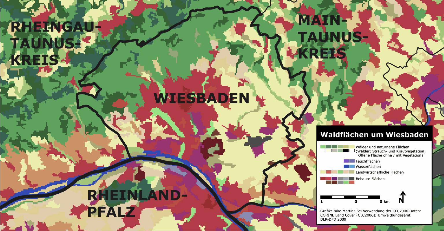 Waldflächen um Wiesbaden (Grafik: Niko Martin; Bei Verwendung der CLC2006 Daten: CORINE Land Cover (CLC2006); Umweltbundesamt,  DLR-DFD 2009)
