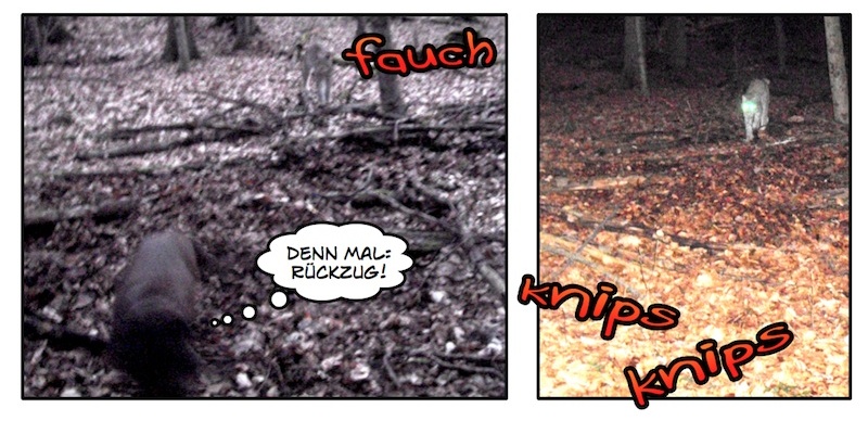 In der Abenddämmerung des nächsten Tages gehen Jäger und Hund noch einmal zum Riss. Jetzt sitzt der Luchs bei seiner Beute und macht keinerlei Anstalten sie aufzugeben. Bei Futterdieben, sagt sich die große Katze, bin ich aber sowas von stur. Der Jäger traut seinen Augen nicht, kramt seine Kamera aus dem Rucksack und dokumentiert die Szenerie. Der Luchs richtet sich auf und faucht.