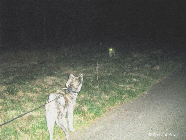 Mein Hund Inu nimmt eine Spur auf, zerrt an der zehn Meter langen Leine, steht dann und knurrt; Taschenlampe an, zwei glühende Augen starren uns an. Eine Katze, so groß wie ein Schäferhund liegt im Unterholz, Entfernung 8-10 Meter. Der Hund will zum Luchs, der Luchs zum Hund. Also langsamer Rückzug. Der Luchs folgt uns. Ich will kein Risiko eingehen, renne los, den Hund hinter mir herziehend. Die Katze lässt sich nicht abschütteln. Noch etwa 150 Meter folgt sie uns, schwingt sich dann auf einen Holzstoß und bleibt dort sitzen. Der Puls hämmert, der Schweiß auf der Stirn, aber ich bin glücklich über diese seltene Begegnung.